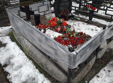 Так выглядит окончательный вариант места захоронения: памятники являются точной зеркальной копией друг друга, на землю уложена брусчатка, металлическое ограждение заменено на гранитный цоколь.